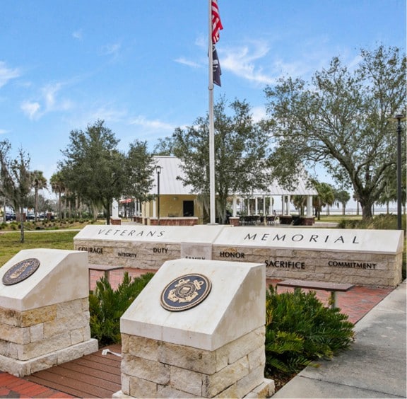 • En la orilla del lago Kissimmee, un monumento de mármol y piedra rinde homenaje a los veteranos por sus servicios.